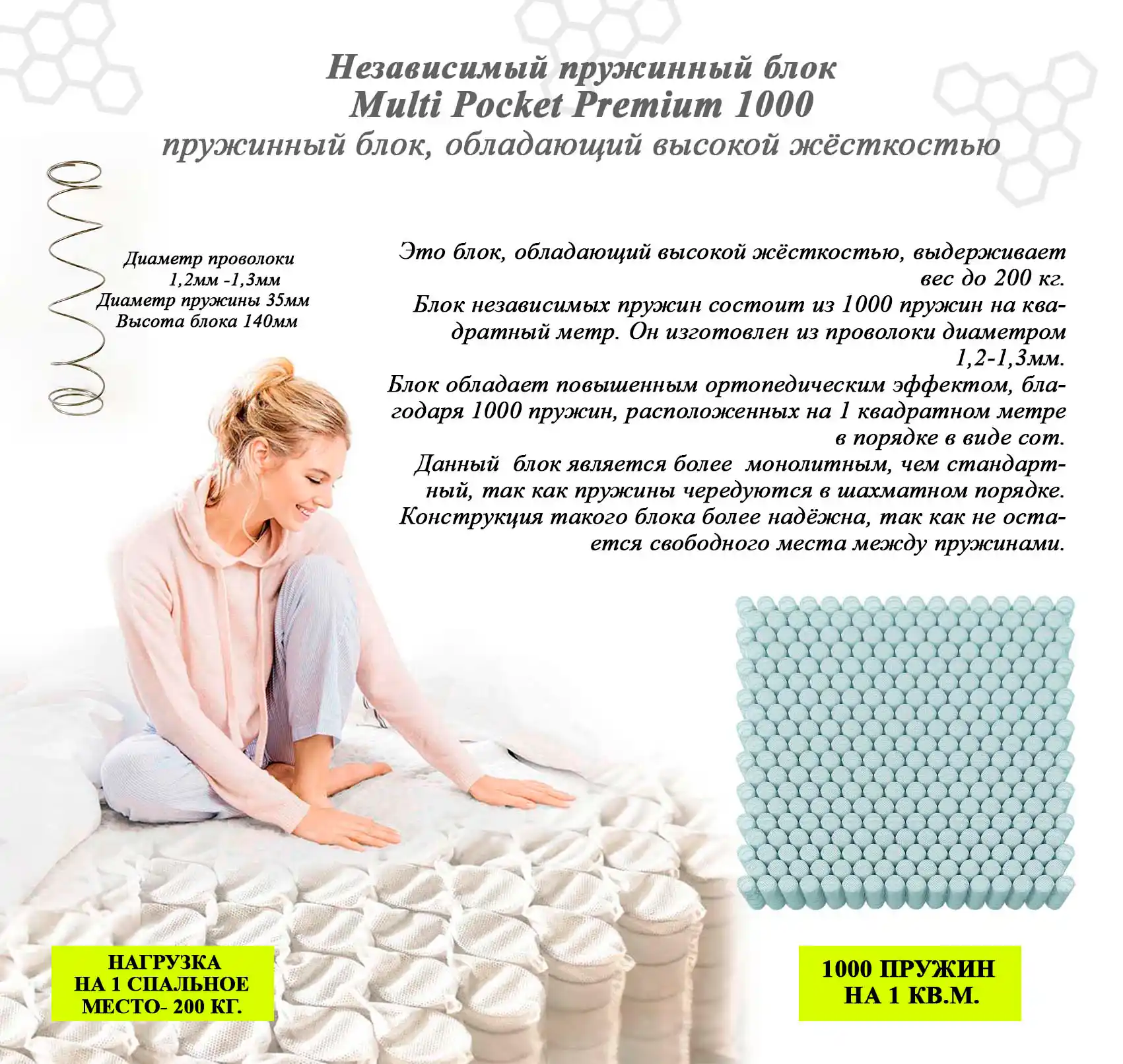 • Пружинный блок: независимый Multi Pocket Premium 1000 (2000 пружин/место, h 14 см, шахматное расположение)
