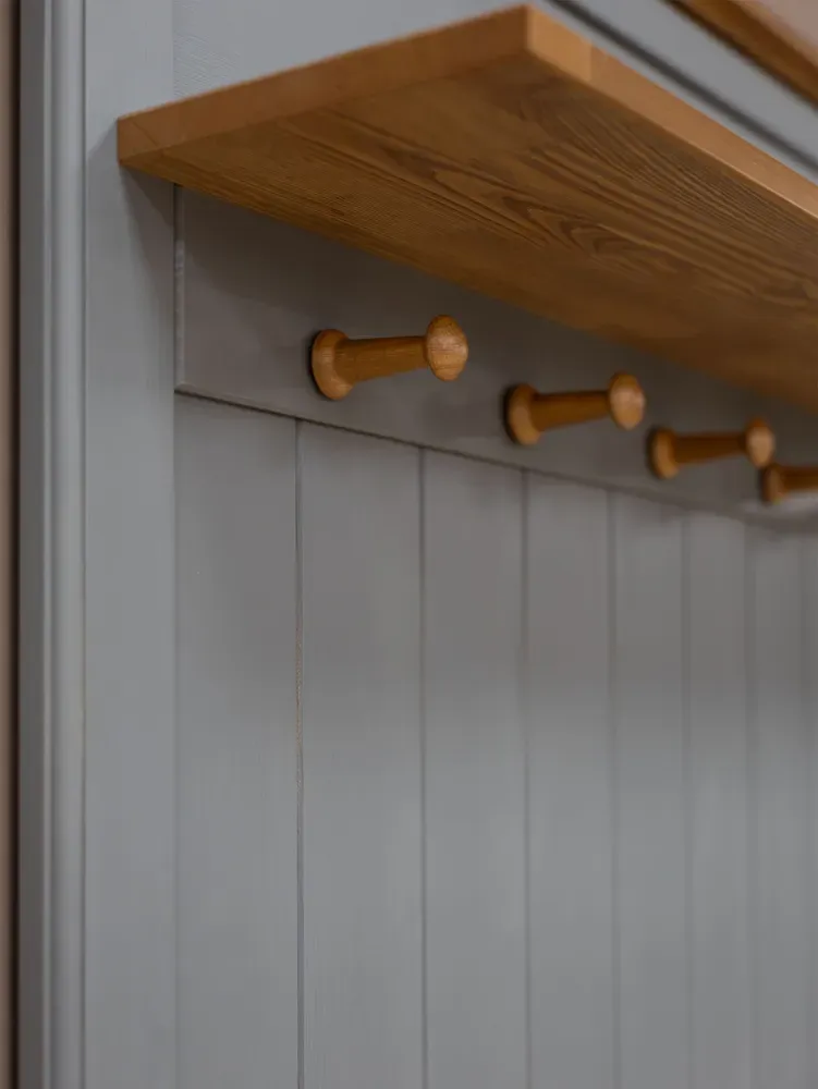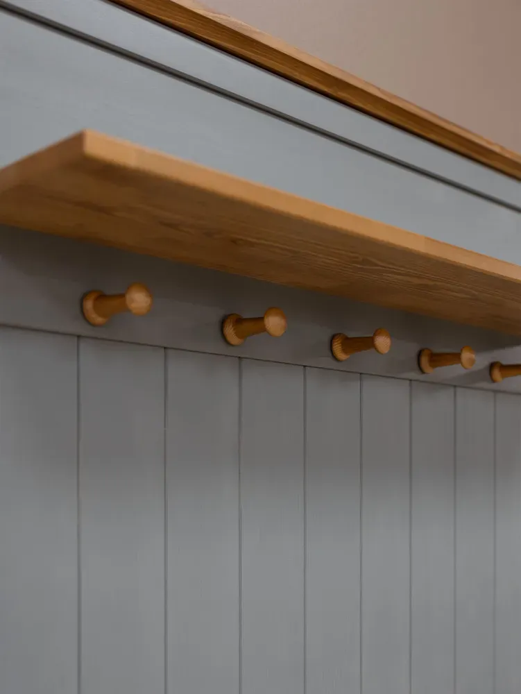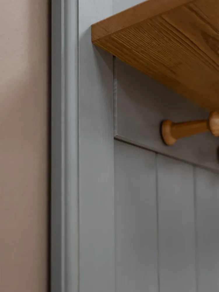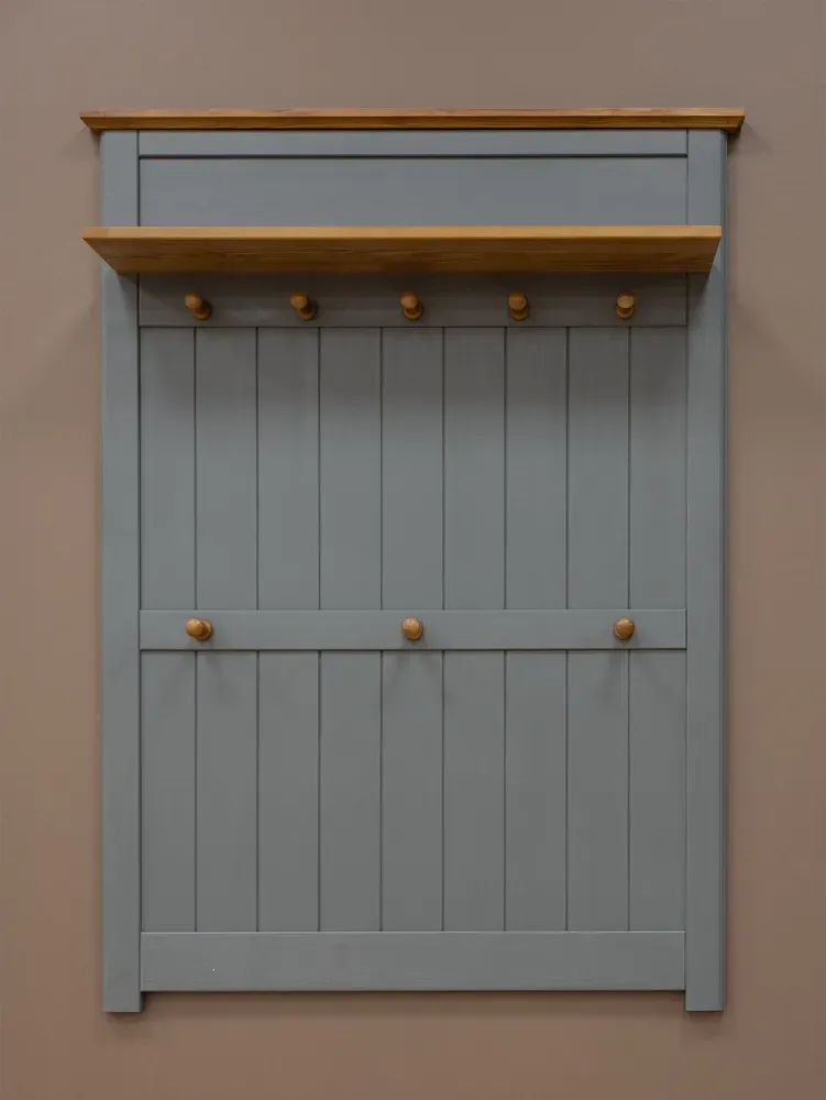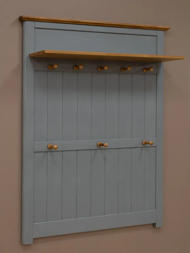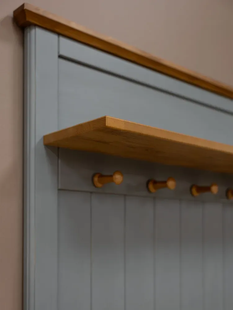 К панели крепятся 8 деревянных крючков для верхней одежды, сумок и зонтов, а также полка для головных уборов, варежек, перчаток. Панель вешалки выполнена в сером цвете, а карниз, крючки и шляпная полка в цвете антик. Другие варианты окрашивания: «белый/антик» и «черный/антик». Преимущество мебели «Пенни» – качественные гипоаллергенные лаки на водной основе от известного производителя Backer Acroma (Швеция). Панель вешалки декорирована вертикальной фрезеровкой.
