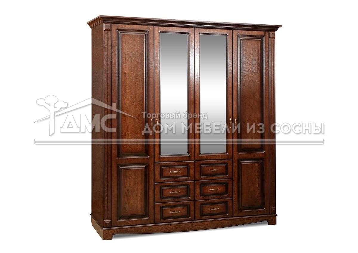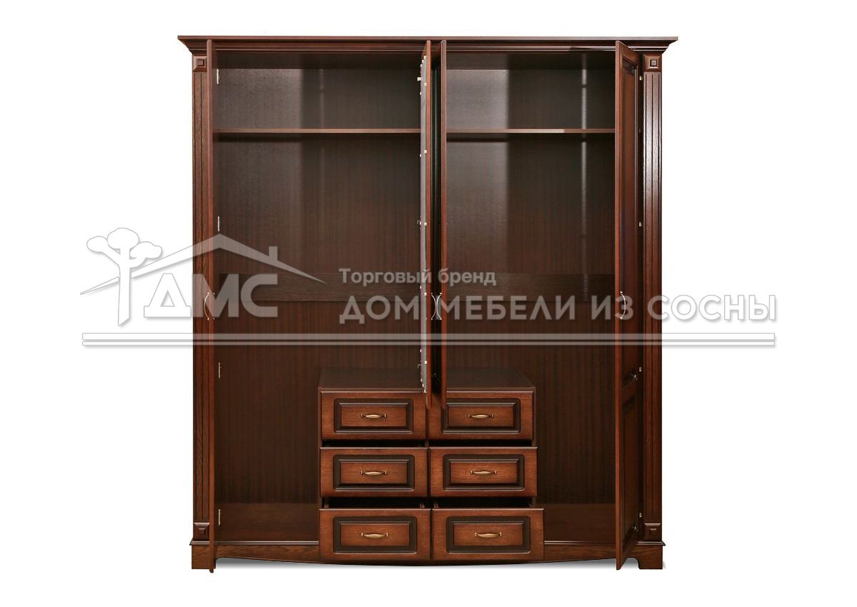 Ищете надёжное и вместительное место для хранения одежды? Тогда вам подойдёт высокий 4-створчатый шкаф «Версаль»! Этот шкаф оснащён большими и вместительными отделами, которые способны уместить гардероб всей семьи. За распашными дверцами находятся полки и штанга, которые выдерживают большие весовые нагрузки. Также для хранения предусмотрено 6 выдвижных ящиков на роликовых направляющих.