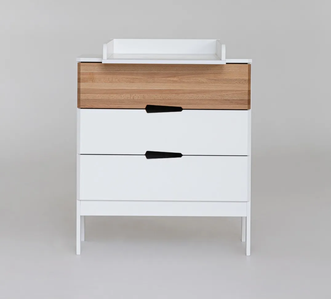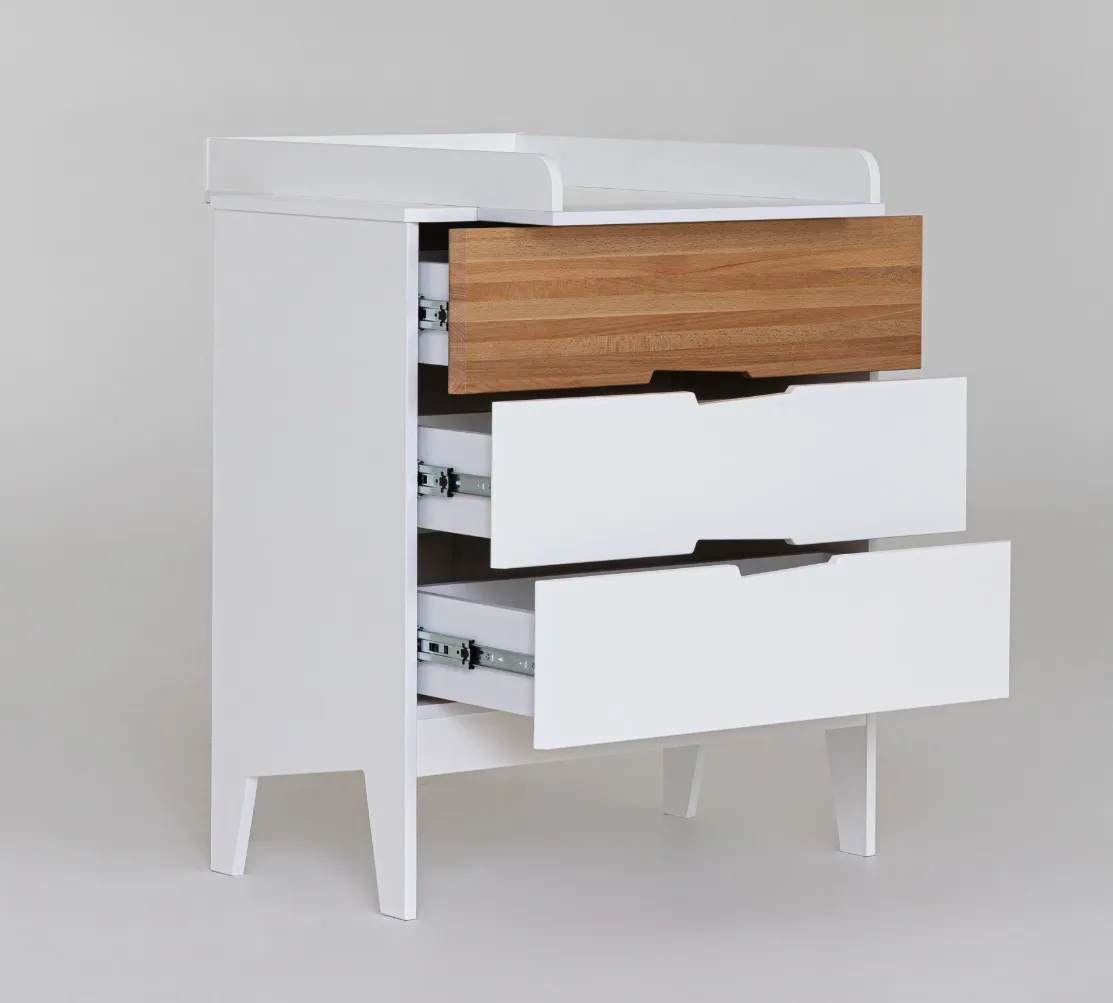🛠️ Функциональность. Комод оснащён съёмным пеленальным столиком, что делает его незаменимым помощником для родителей. Три функциональных ящика на телескопических направляющих с тихим ходом и плавным закрыванием обеспечивают удобное хранение вещей.