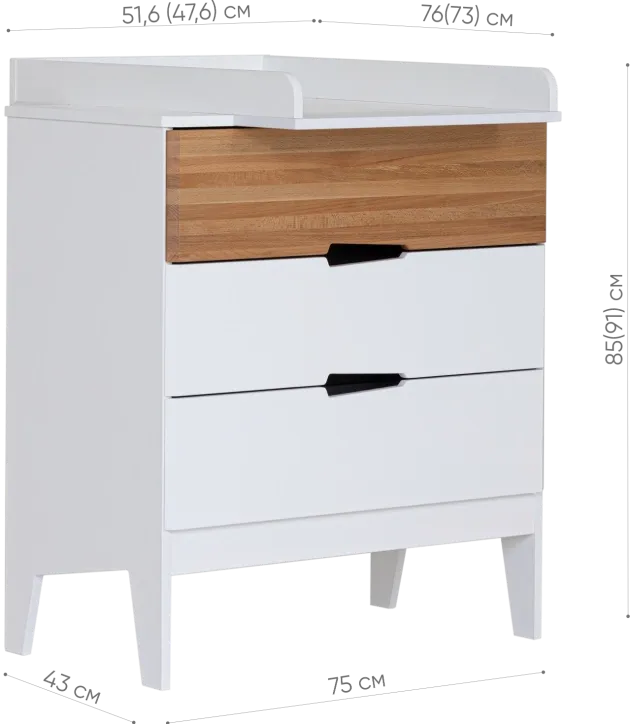 📏 Оптимальные размеры. Габариты комода с учётом пеленального столика составляют 750 x 760 x 910 мм. Это позволяет разместить его даже в небольшом помещении, не занимая много места.
