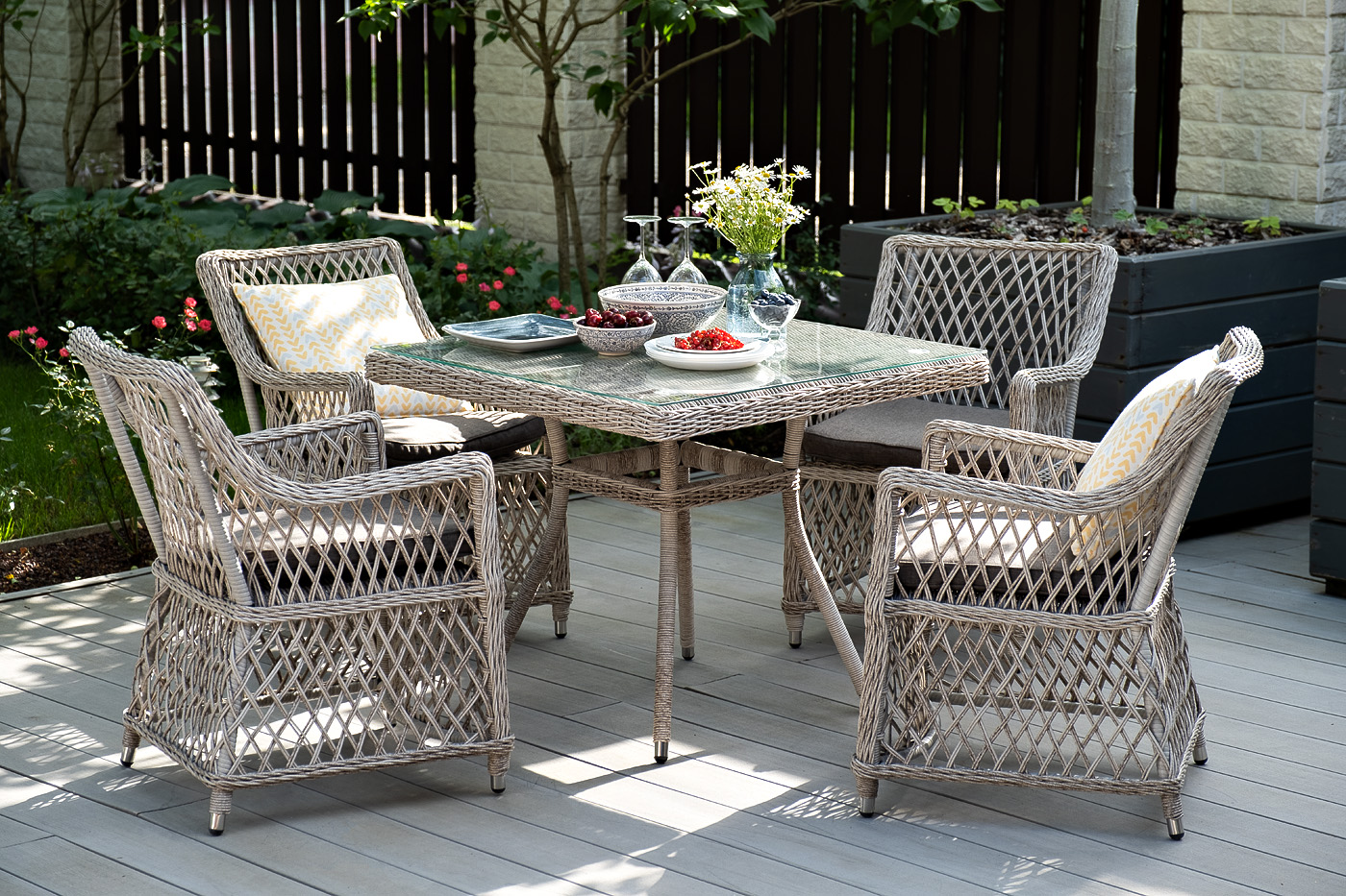 Обеденная группа «Арлиш» в натурально бежевом оттенке. В комплекте: - квадратный обеденный стол, размером 900х900х750 мм - 4 классических пелетных кресла - 680х550х840 мм Каркас мебели выполнен из прочного и легкого алюминия, оплетенного вручную искусственным ротангом бежевого цвета, столешница – закаленное стекло. В комплект к стульям предусмотрены подушки со съемными чехлами, которые обработаны влагоотталкивающими пропитками. Изделия можно купить по отдельности. Набор есть также в других отетнках: соломенный, коричневый и графит. "Арлиш" стол плетеный из искусственного ротанга, цвет бежевый 1шт. 900Х900Х750, "Латтини" плетеное кресло из искусственного ротанга, цвет бежевый 4шт. 550Х660Х850,