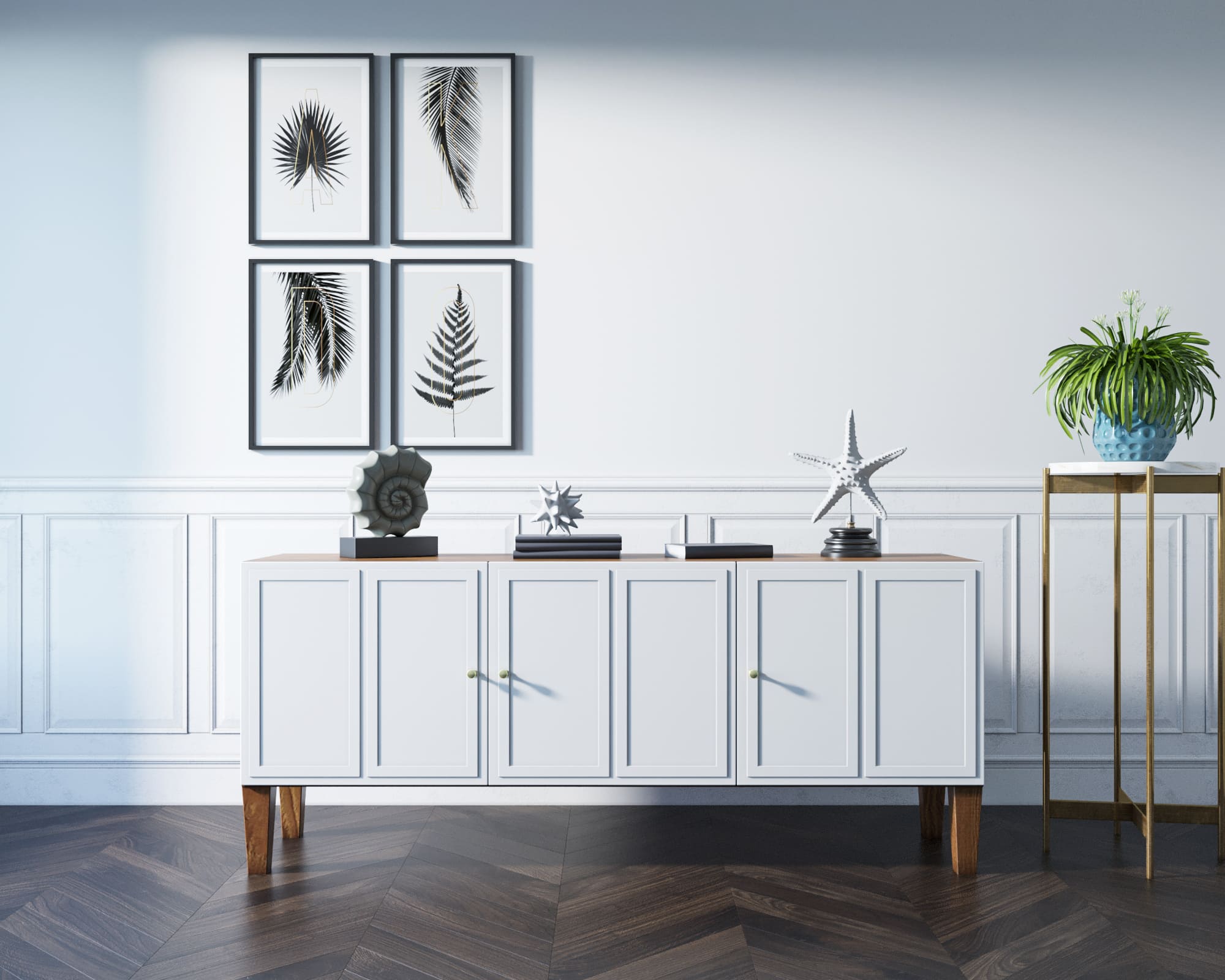 Основательность конструкции придают фасады с прямыми рамками и ножки из массива ясеня в цвете орех.