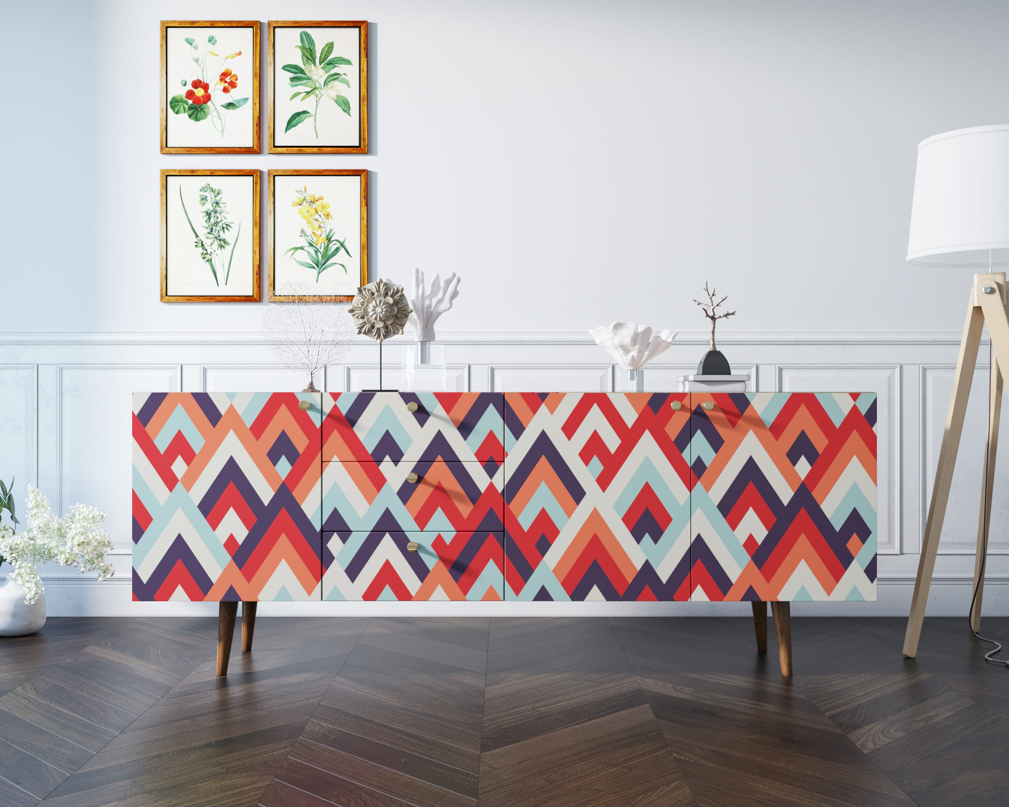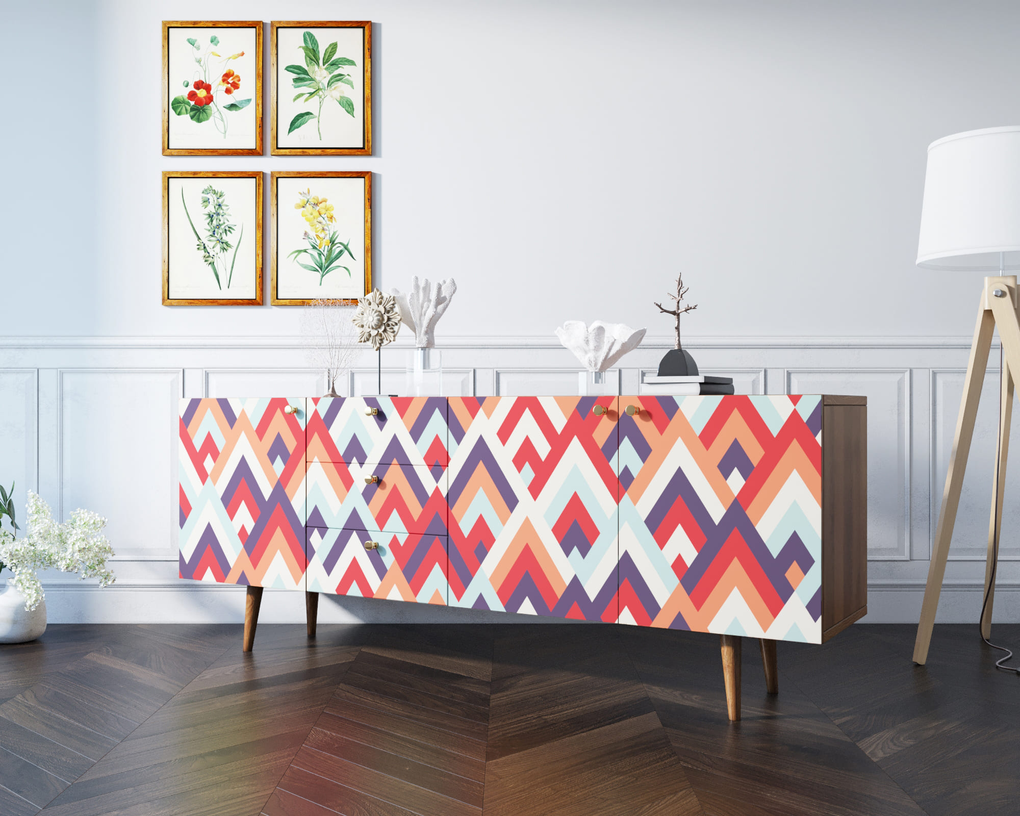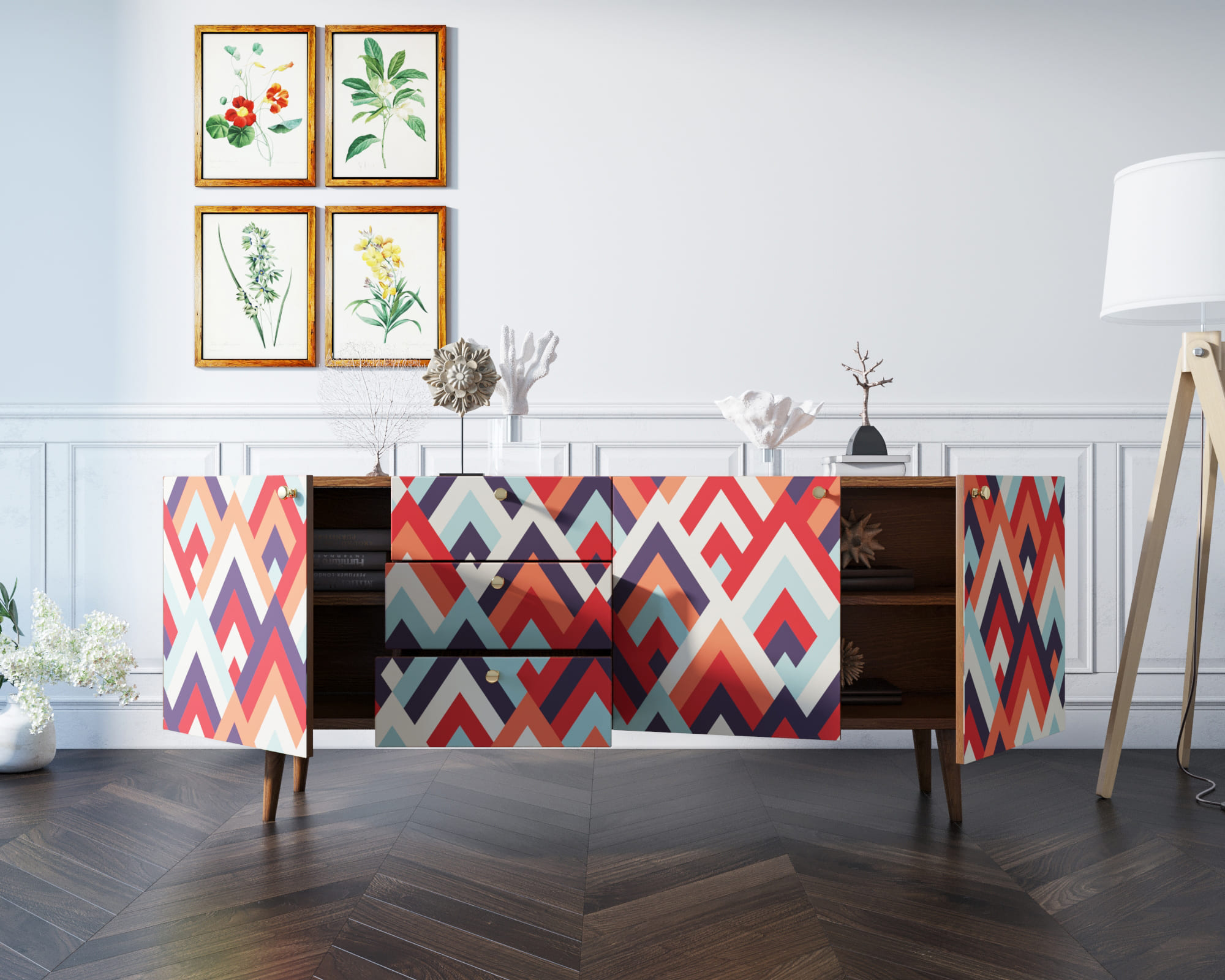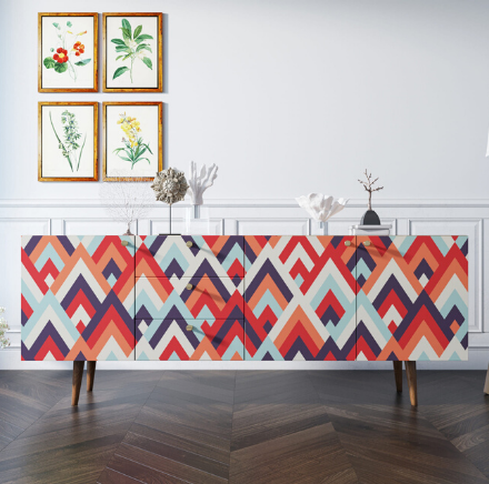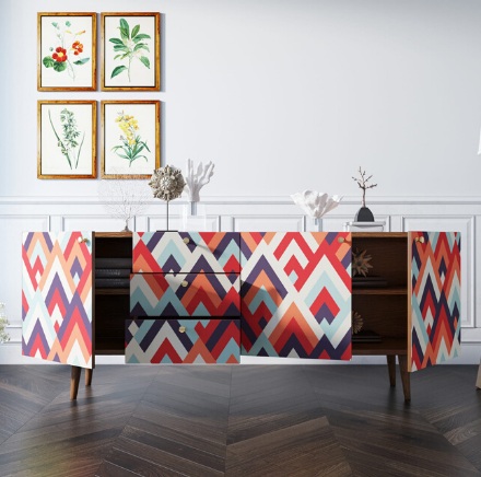 Корпус и фасады изготавливаются из ЛДСП австрийской компании "EGGER". Ножки мы делаем из массива ясеня и крепим на стальную пластину, на дверях петли с доводчиком а на ящиках шариковые направляющие. Принт на фасады наносится принтером специальными УФ - чернилами.