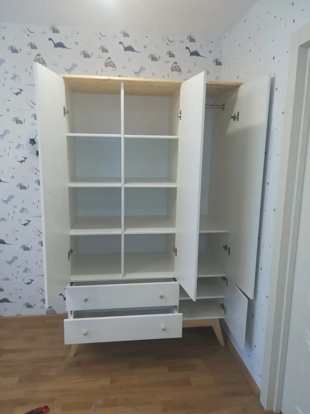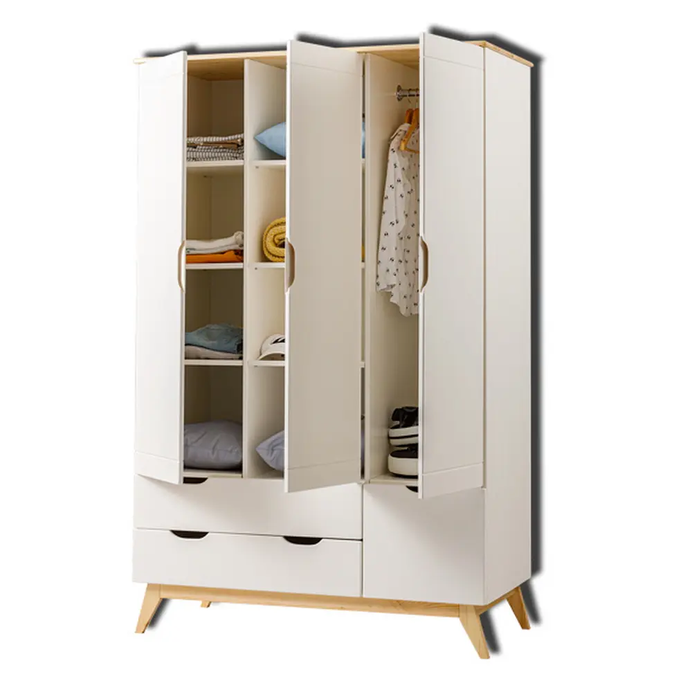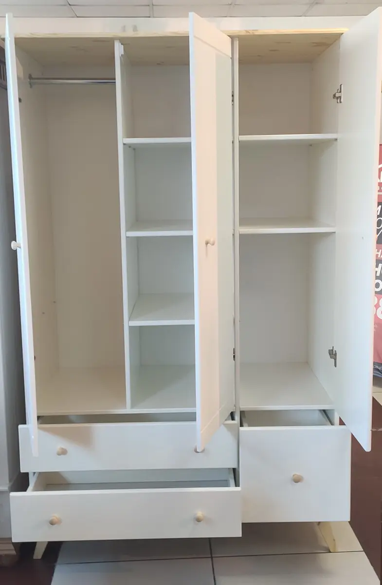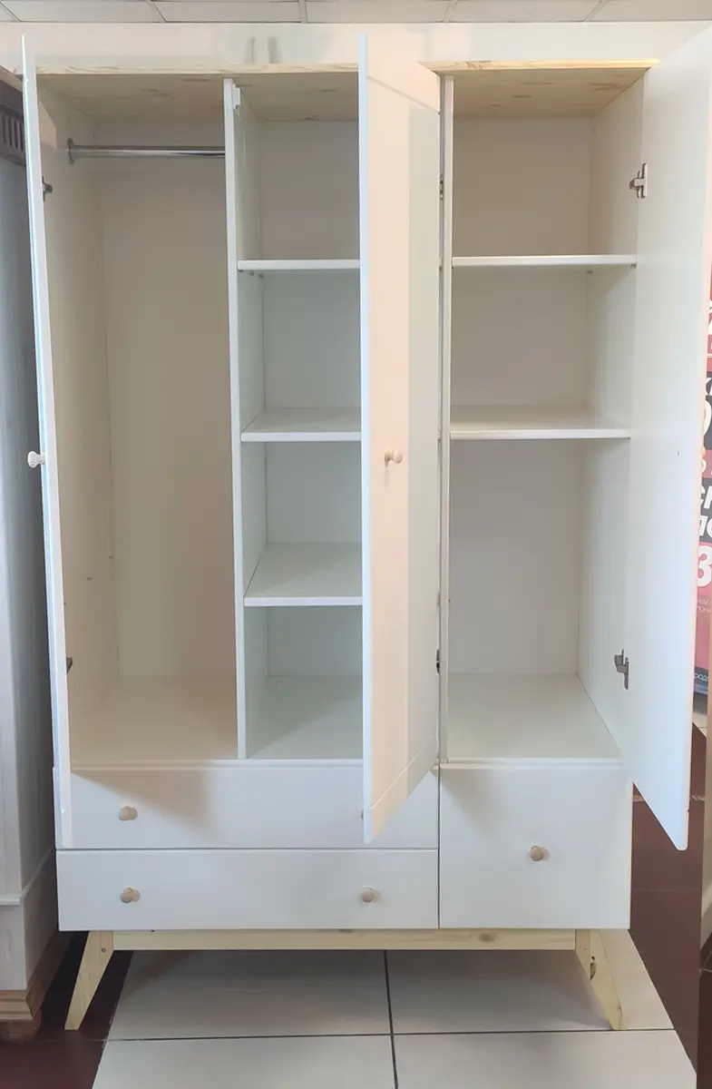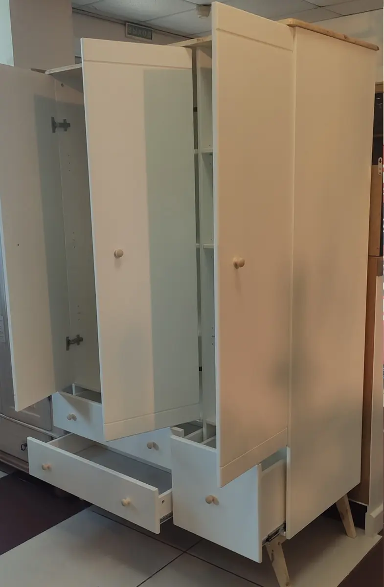Шкаф имеет три створки и множество отделений, которые позволяют удобно разместить все вещи ребёнка. Слева и по центру расположены отделения с полками (по 3 штуки), а справа — отделение со штангой. Это позволяет хранить одежду, обувь, книги, игрушки и другие предметы в порядке и доступности.