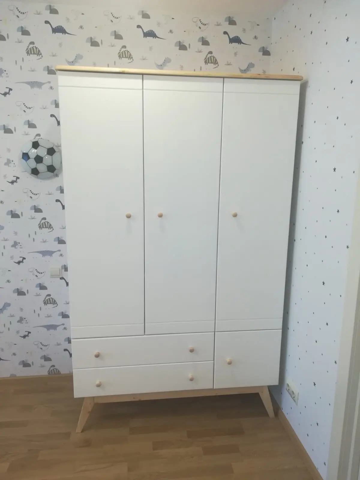 Размеры фасадов ящиков — 177х798 (длинные) — 2 шт., 398х357 — 1 шт. (правый), двери — 398х1358 — 3 шт., полки — 364х560. Глубина ящиков — 350 мм, высота стенок малых ящиков — 110 мм, большого — 270 мм. Высота ножек с горизонтальной планкой — 240 мм. Материал — сосна, задняя стенка, дно ящиков — ДВП белого цвета. Фурнитура без доводчиков. Ручки по выбору — деревянные кнопки (по умолчанию), кружки, квадраты, сердечки, запилы (на фото). Рекомендуется профессиональная сборка.