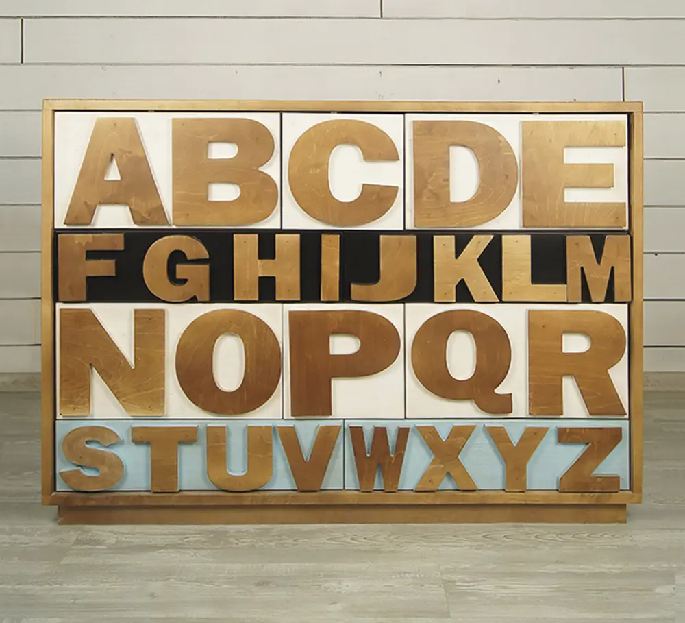 Комод "Alphabeto Birch" снабжен 10 ящиками разных форм,