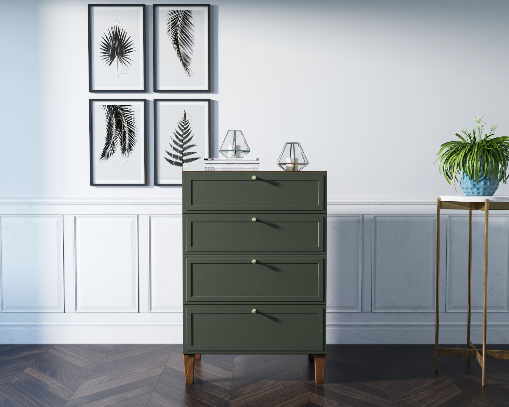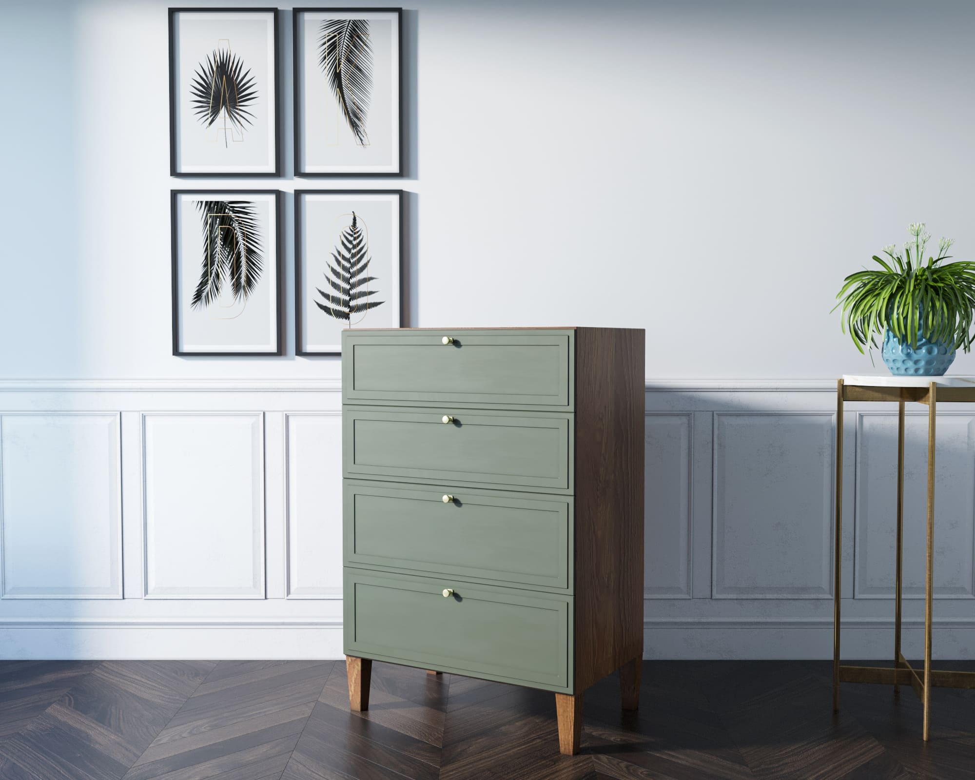 Фасады имеют приятный зеленый оттенок. Корпус комода выполнен из шпона ясеня.