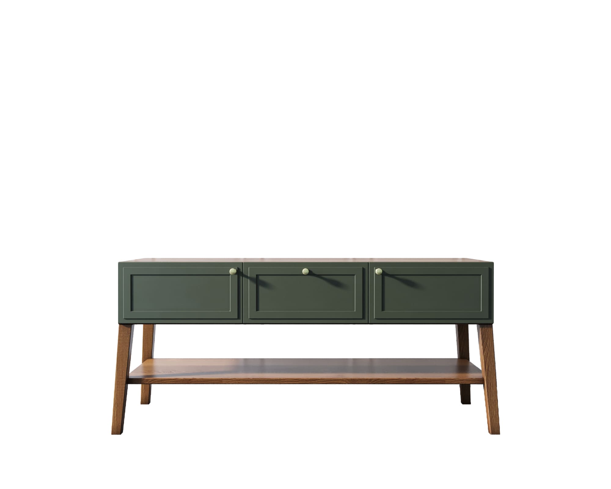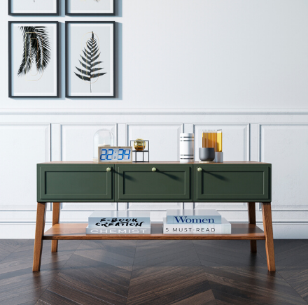 Три оригинальных фасада приятного зеленого оттенка с прямыми рамками выигрышно смотрятся с ножками из массива ясеня в цвете орех.