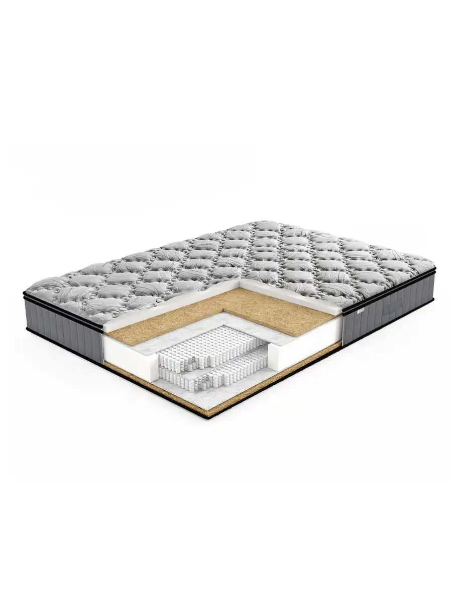 • Слои (симметричные): пена Orto Flex (30 мм) → сизаль (10 мм) → хлопковый войлок (изоляция) → двойной пружинный блок Micro Pocket → зеркальное повторение.