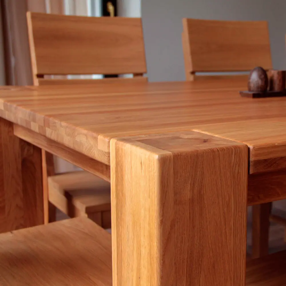 Стол обеденный 1400*900*750 столешница с фальшпанелью (фальшпанель - декоративный элемент визуально увеличивающий толщину столешницы), Сечение ног стола 90*90 мм , столешница толщиной 40 мм. Стол изготовлен из натурального массива дуба. Особенности: в изготовлении используется цельноламельный щит.