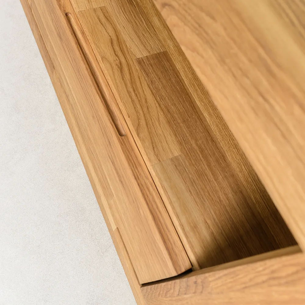У тумбы три открытые ниши и три выдвижных ящика. Ящики устанавливаются на шариковых направляющих AKS с доводчиками, закрываются плавно и бесшумно. На ящиках нет выступающих ручек. Габариты (ШхГлхВ) 1750х550х500 мм, вес 73 кг. Изделие поставляется в собранном виде. Гарантия на тумбу – 1 год.
