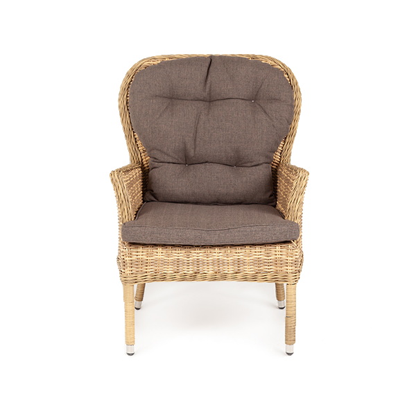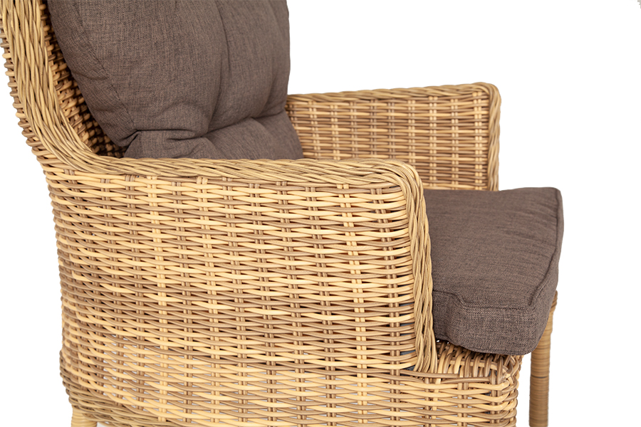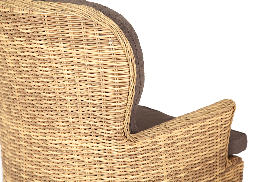 Кресло "Алиса" имеет нестандартную форму и хорошо сочетается с круглыми столиками. Размер модели – 710×820×1105 мм. Каркас выполнен из высококачественного алюминия, который оплетен круглым искусственным ротангом соломенного цвета. В садовое кресло укомплектовывается мягкими подушками. Они пошиты из износостойкого полиэстера серо-коричневого оттенка с плотностью 230гр/м2. Защитные свойства синтетического материала усиливаются благодаря влагоотталкивающей пропитке.
