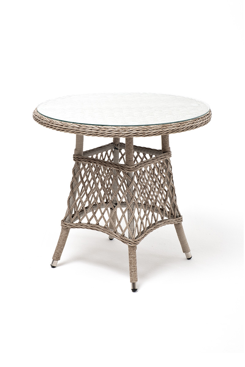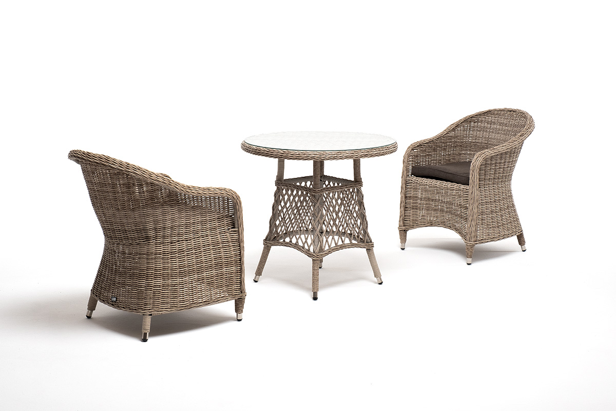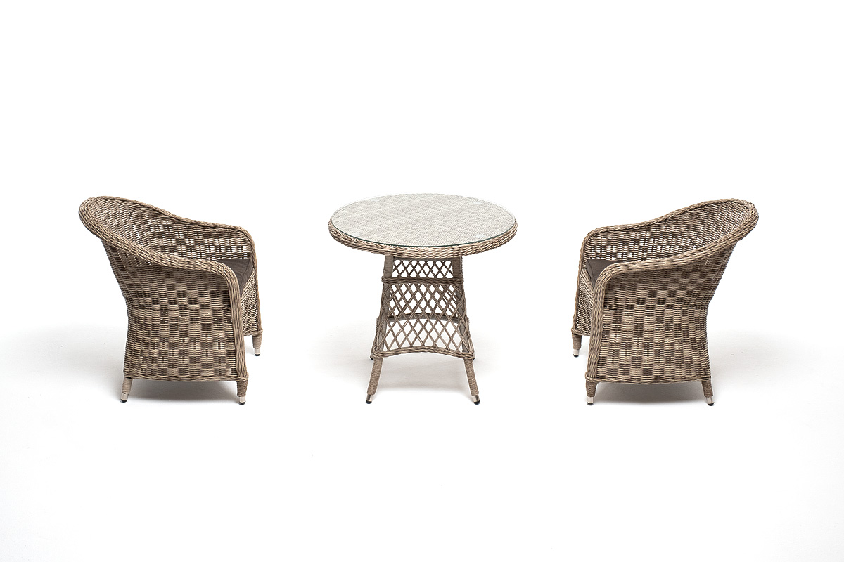 Комплект "Эспреззо-80 R" можно использовать в качестве обеденной группы на 2 персоны или как кофейный комплект на балконе или террасе. В плетеный комплект входит круглый стол «Эспреззо» диаметром 80 см с ударопрочной стеклянной столешницей и 2 кресла коллекции «Равенс» 570×680×810 мм. Набор представлен в бежевом цвете. "Эспреззо" плетеный круглый стол, диаметр 80 см, цвет бежевый 1шт. 800Х800Х750, "Равенс" плетеное кресло из искусственного ротанга, цвет бежевый 2шт. 570Х680Х810,