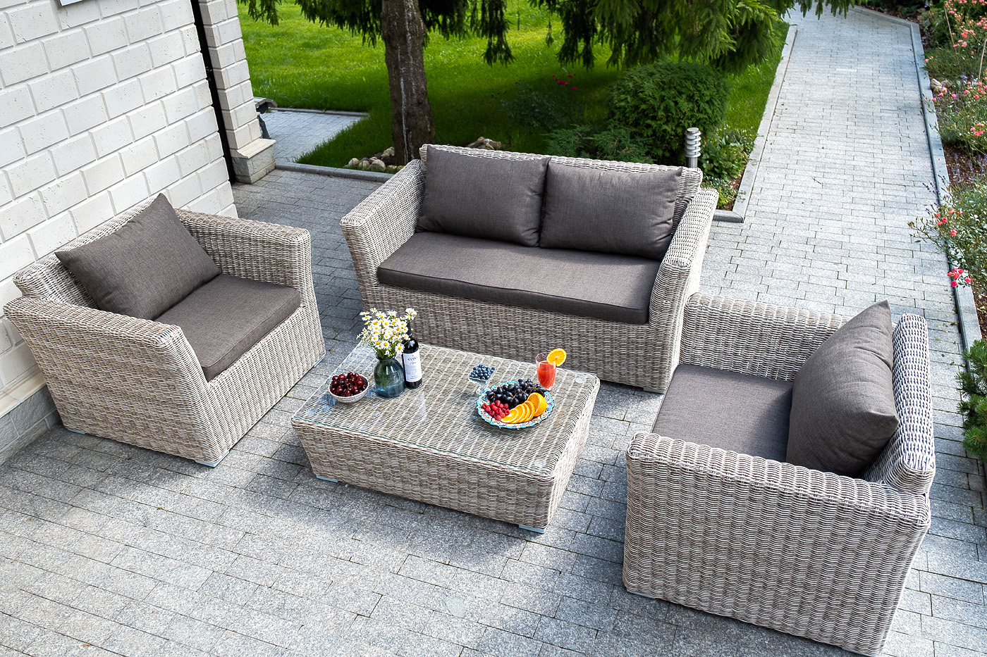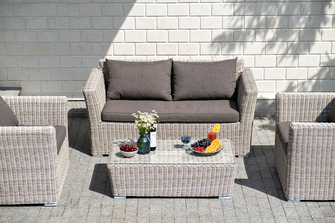 Диван "Капуто" подходит для удобного размещения двух персон. Он имеет алюминиевый каркас, который выдерживает высокие нагрузки. Размер модели – 1700×865×815 мм. Диван выполнен из искусственного ротанга натурального бежевого цвета с помощью ручного круглого плетения. Укомплектован двухместный диван подушками со съемными чехлами. Они пошиты из прочного полиэстера. Материал обеспечивает защиту текстильным изделиям, которая усиливается за счет влагоотталкивающей пропитки ткани.