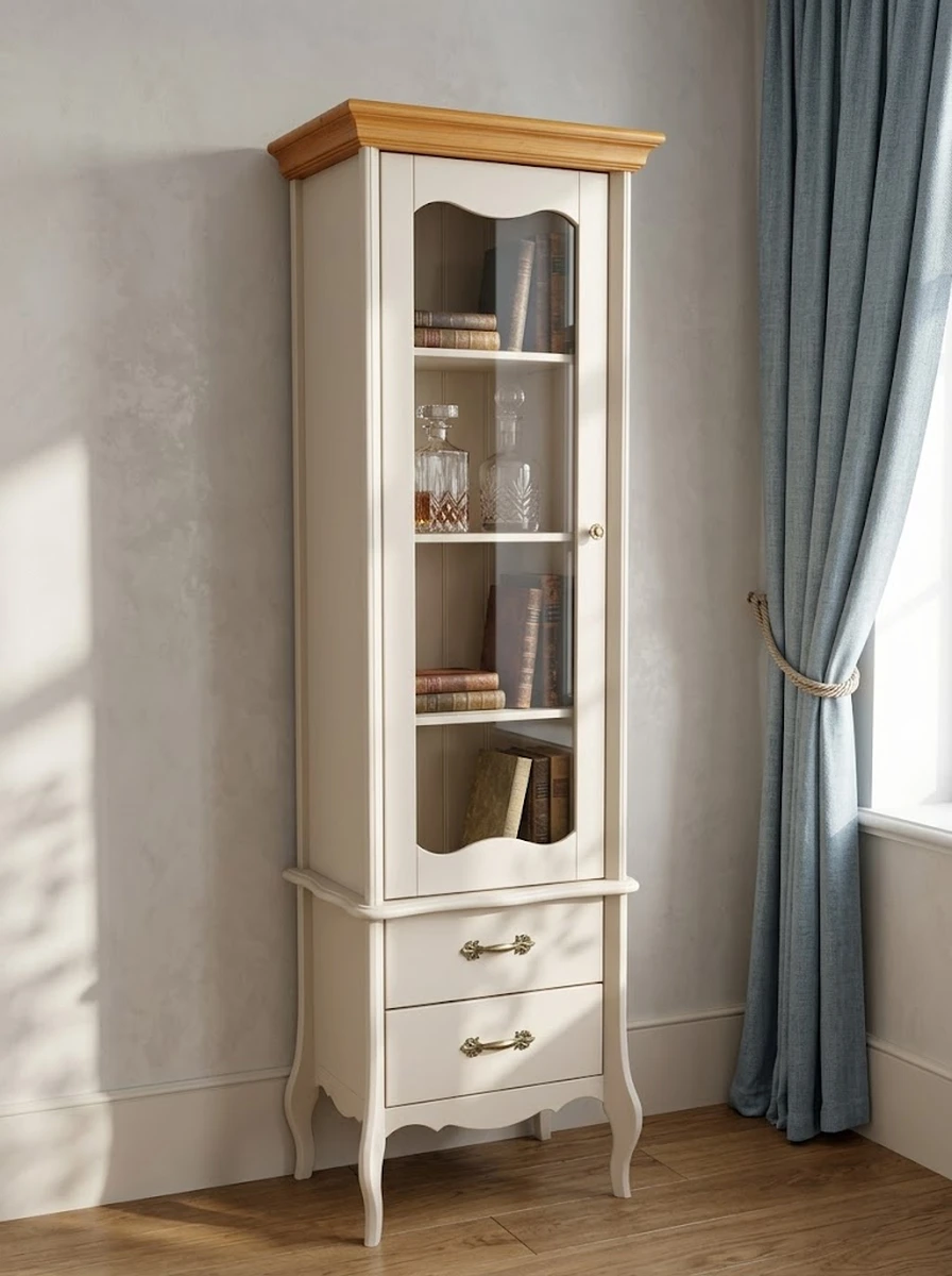 Узкая витрина комплектуется 3 полками, которые можно переставлять по высоте и 2 ящиками. Направляющие ящиков с доводчиками скрытого монтажа от крупнейшего международного предприятия BLUM (Австрия). Это обеспечивает плавный ход ящиков и бесшумное открывание и зарывание. Внутренние части выдвижных ящиков окрашены в цвет фасадов мебели. В коллекции так же используются мебельные ручки фирмы Giusti (Италия). Задняя стенка витрины выполнена из вагонки. Высота ножек 180 мм. Изделие полностью изготовлено из экологически чистого массива сосны. Поставляется в цвете – «бежевый» воск и «бежевый воск/антик». Комбинация цвета «бежевый/антик» подразумевает отделку карниза в цвет «антик», остальная часть изделия в цвете «бежевый».