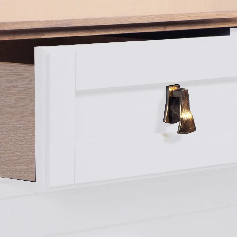 Фасадные части комода изготовлены из массива клеёного дуба, что придаёт ему прочность и долговечность. Каркас выполнен из клеёной древесины (дуб) и МДФ, облицованного шпоном (дуб). Опоры, обкладка и накладки также выполнены из массива.