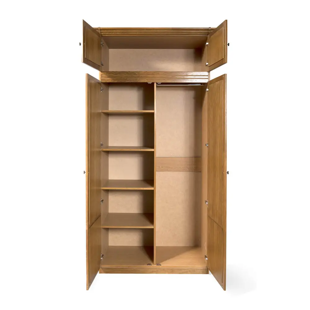 Шкаф двухдверный с зеркалом классически строгих форм с фасадами рамочно-филенчатой конструкции, резным карнизом и шикарной лицевой фурнитурой. Для удобства размещения и хранения белья, одежды и прочих предметов личного гардероба шкаф имеет двухсекционное двухстворчатое отделение с зеркальными распашными дверцами, оснащенное четырьмя бельевыми полками и штангой для плечиков, а также малое двустворчатое отделение-антресоль.