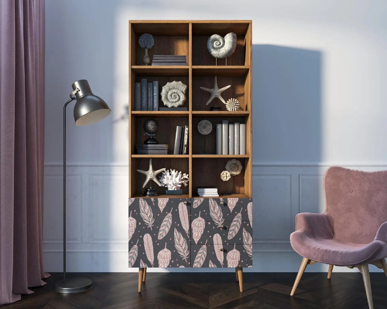 Стеллаж с дизайнерским принтом на фасаде имеет три небольших ящика полного выдвижения на шариковых направляющих. Левая секция за дверкой разделена полкой, которая регулируется по высоте. Ноги изготовлены из прочного массива ясеня.