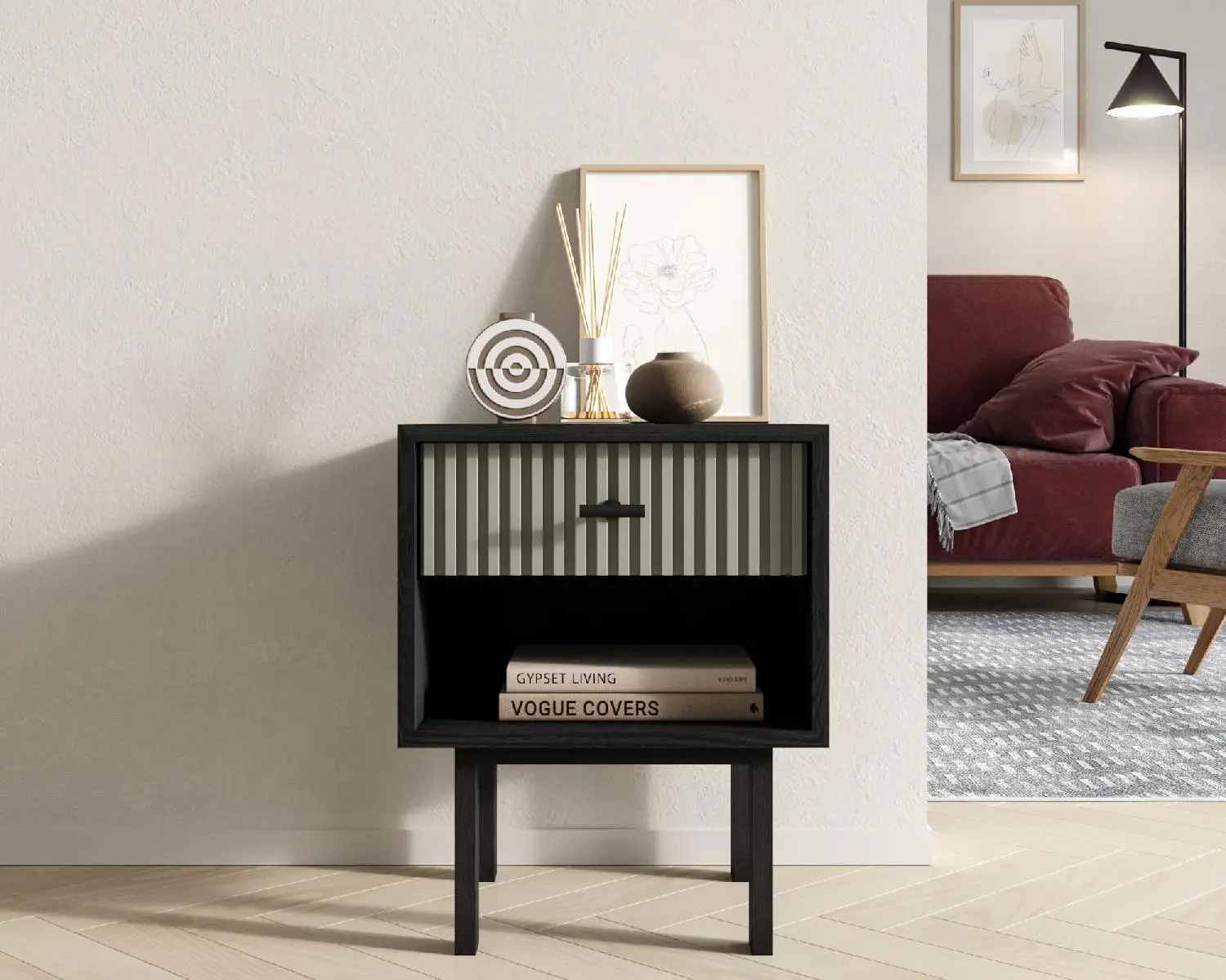Фасады тумбы изготовлены из ламинированной древесно-стружечной плиты (ЛДСП), которая обеспечивает долговечность и надёжность изделия. Внутри тумбы расположены один или два ящика с шариковыми направляющими без доводчика. Это позволяет легко открывать и закрывать ящики.